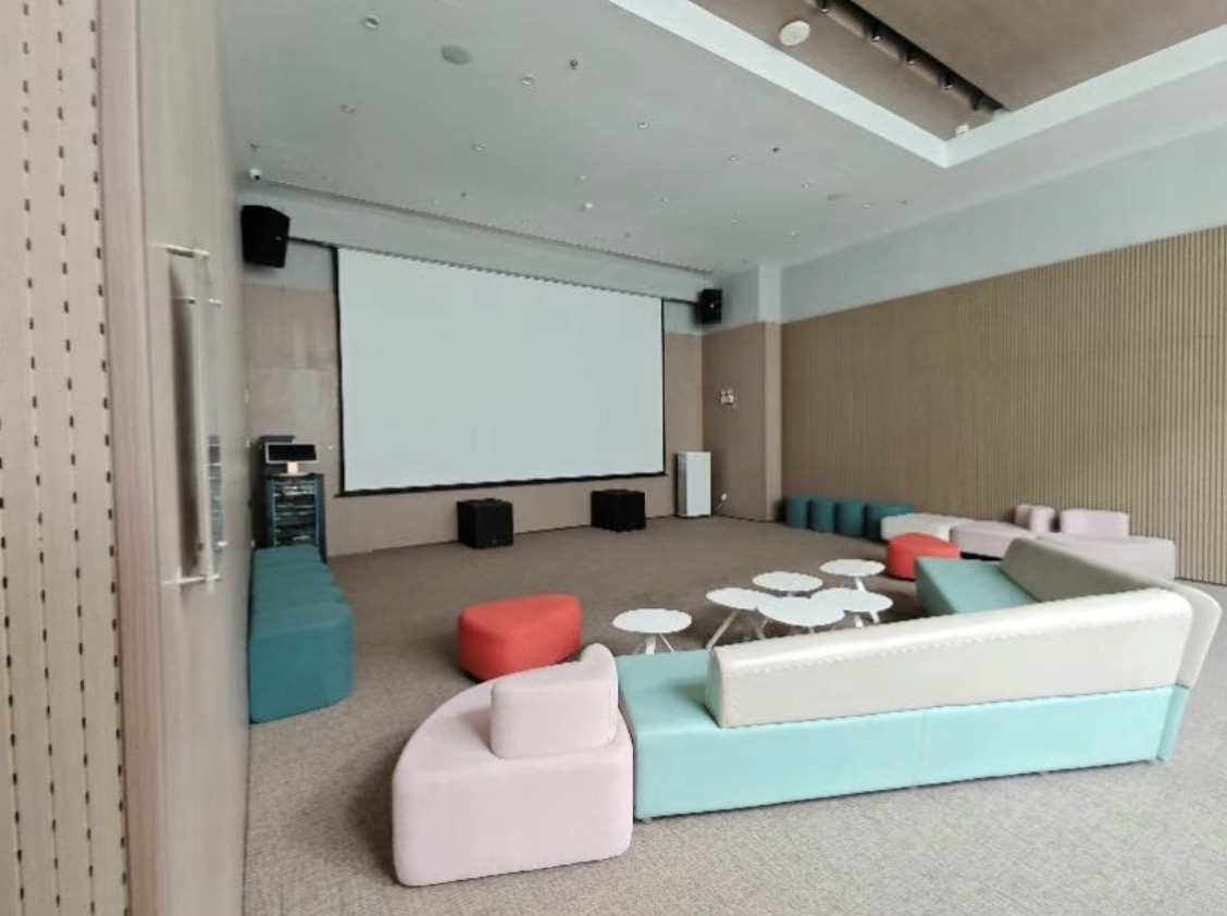 The multimedia room is equipped with a sound system and large screen, supporting activities from karaoke and movie viewing to academic discussions.
