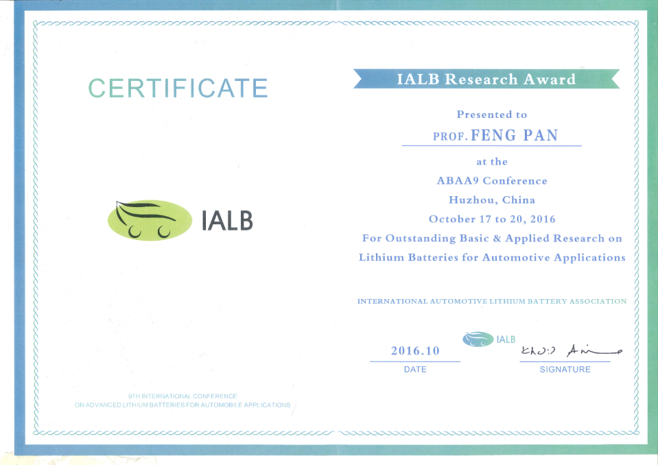 在该领域取得了一系列国际有影响力的科学发现和技术创新成果,并承担了国家的多项重点研发项目, 如2013年作为科技协同创新中心与深圳企业共同承担了国家电动汽车动力电池的重大创新工程,2015年创建了“电动汽车动力电池与材料国际联合研究中心(国家级研究中心)”,2016年又承担了国家材料基因组工程重点专项(基于材料基因组技术的全固态锂电池及关键材料研发)等。鉴于团队在新能源电动汽车动力电池与材料方面取得的研发创新成绩,团队负责人潘锋教授获荣获2016年国际电动车锂电池协会(IALB)“杰出研究奖”,并在该协会举办的第九届国际电动车新型锂电池会议上(简称“ABAA9”,2016年10月,浙江湖州) 作了题为“锂离子电池扩散与热稳定性”的获奖特邀报告。报告介绍了团队近年来在锂电池的锂离子的扩散性能和电极材料的热稳定性等方面研究取得重要进展,从理论计算到实验测试等多维度剖析了影响锂离子扩散和电极材料的稳定性的机理。 本次大会一同获奖的还有英国剑桥大学Peter Bruce 教授(英国皇家科英雄联盟博彩网站