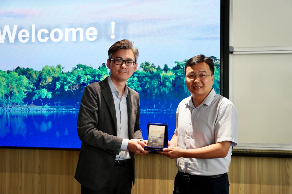 九位教师代表依次进行课题组介绍和学术分享,详细展示各自研究团队在先进碳材料、能源材料与材料基因组工程、有机光电与先进显示材料、AI for Materials等前沿领域的最新研究成果和特色优势。在茶歇交流环节,双方师生就硕士项目申请流程、具体研究方向匹配等要点展开务实交流。仪式尾声,肖荫果副院长与马来亚大学KHIN WEE LAI副教授互赠纪念品,双方一致表示将以此次访问为契机,进一步深化在人才培养、科研协同创新等领域的合作。