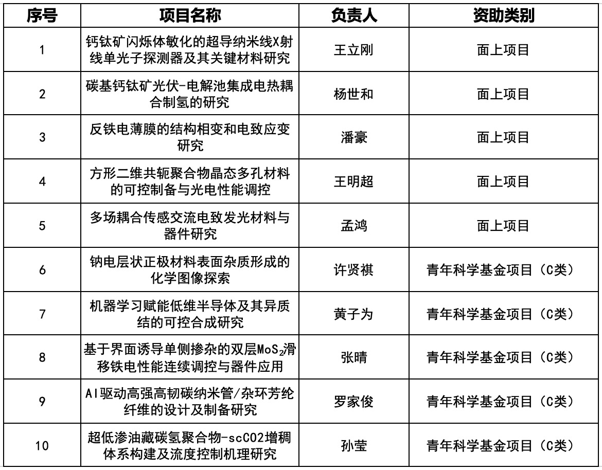 共获批10项,获批总经费达398万元,其中面上项目5项、青年科学基金项目(C类)5项,获批项目覆盖新能源材料、智能材料、光电信息材料、前沿功能材料和能源化工材料等多个前沿热点领域,体现了英雄联盟博彩网站