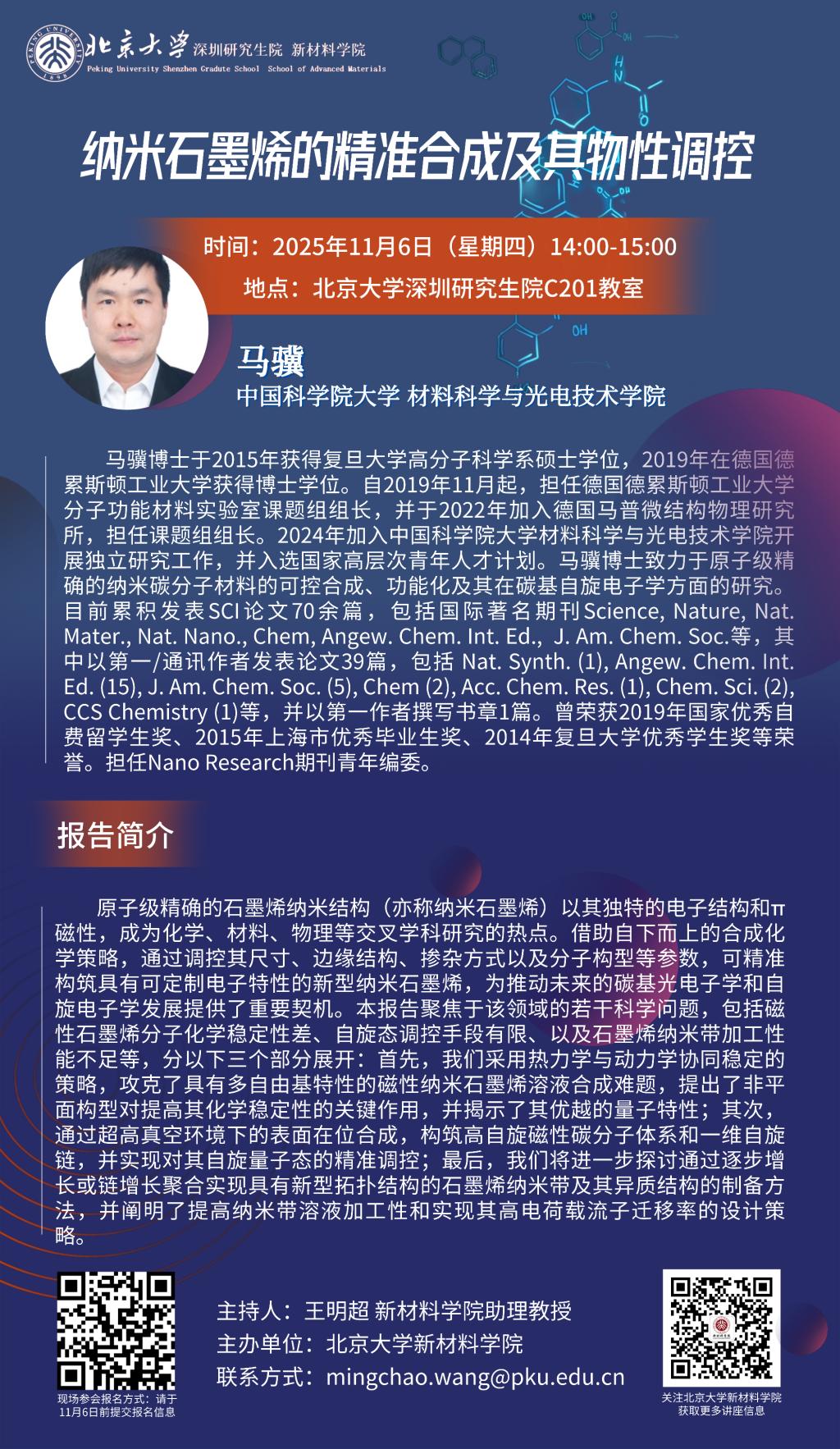 开展独立研究工作,并入选国家高层次青年人才计划。马骥博士致力于原子级精确的纳米碳分子材料的可控合成、功能化及其在碳基自旋电子学方面的研究。目前累积发表SCI论文70余篇,包括国际著名期刊Science, Nature, Nat. Mater., Nat. Nano., Chem, Angew. Chem. Int. Ed., J. Am. Chem. Soc.等,其中以第一/通讯作者发表论文39篇,包括 Nat. Synth. (1), Angew. Chem. Int. Ed. (15), J. Am. Chem. Soc. (5), Chem (2), Acc. Chem. Res. (1), Chem. Sci. (2), CCS Chemistry (1)等,并以第一作者撰写书章1篇。曾荣获2019年国家优秀自费留学生奖、2015年上海市优秀毕业生奖、2014年复旦大学优秀学生奖等荣誉。担任Nano Research期刊青年编委。