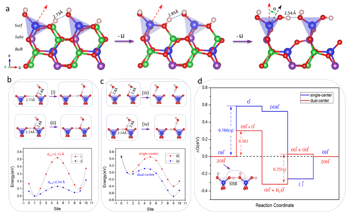 图二. βII相Li2CoSiO4表面短氢键的形成及双中心催化OER反应的机理