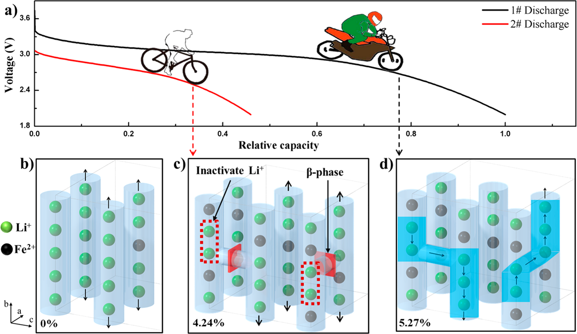 潘锋教授课题组最近在LiMn1-xFexPO4材料的结构与性能研究取得重要进展。他们成功合成了两种高铁锂反位量的α-LiMn1-xFexPO4纳米材料(50纳米的颗粒),相近的反位程度却表现出来了极大的电化学性能差异。通过和布鲁克海文国家实验室、德国于利希国家实验室、美国阿贡国家实验室等合作,对两种材料的结构进行了深入分析,用高精度球差电子显微镜首次发现磷酸铁锰锂的第二相β-LiMn1-xFexPO4以量子点(2纳米左右)嵌在α-LiMn1-xFexPO4 50纳米颗粒中。研究发现性能好的材料其铁锂反位量高,产生了许多的缺陷位置,使得锂离子的传输从一维锂离子通道传输因为这些缺陷点打通相邻的其他方向的传输,从而扩展成为具有三维锂离子通道的电池材料,从而提高的该锂电池材料的充放电的性能。如果α-LiMn1-xFexPO4材料存在第二相β-LiMn1-xFexPO4以量子点嵌入形成套嵌结构的纳米材料后,嵌入量子点将堵塞部分的锂离子的三维通道传输,从而降低了锂离子的在整个晶体传输效率,从而影响了该锂电池材料的充放的性能。