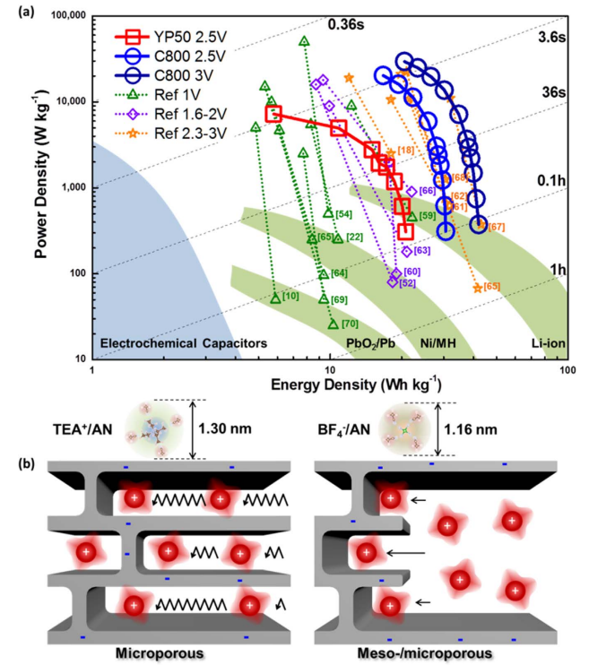 图2.(a)C800和商用YP50的能量密度与功率密度对比图,(b)离子在微孔以及微孔/介孔中的传输示意比较图