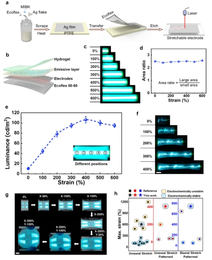 另一个超可拉伸电致发光显示器件。我们进行了各种可拉伸图案和阵列显示的实验,实现了可拉伸电致发光显示领域最高的拉伸性能,其中可拉伸的七段式显示器件在面积为原始状态的7.5倍时仍然可以工作。更重要的是,与传统的三明治超高可拉伸交流薄膜电致发光器件相比,非对称增强的共平面电极交流电致发光器件由于发光层将共平面电极和凝胶相互隔离起来,具有非常优异的电化学稳定性。器件可以稳定工作在高交流电频率和高电压下以实现高亮度和广色域。
