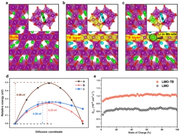 图3:锂离子在尖晶石锰酸锂材料体相中和孪晶晶界附近的扩散模型,以及在不同情况下的扩散能垒和扩散速率对比。