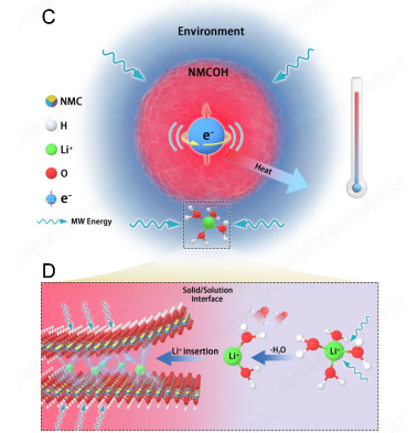 潘锋教授课题组和美国国家同步辐射光源NSLS II白健明教授、Brookhaven国家实验室王峰教授、美国陆军实验室许康教授合作,开发了一种全新高效的微波水热合成方法。如图1所示,通过原位同步辐射XRD追踪了层状正极材料Li(Ni1/3Mn1/3Co1/3)O2 (NMC333)的微波水热合成过程,发现氢氧化物前驱体在160 ℃的低温下极短时间内(4分钟)就转变为层状氧化物产物。通过与原位固相合成实验、原位水热合成实验进行对比,发现了微波水热的反应速率(1.819 min-1)比固相合成(0.091 min-1)和水热合成(0.096 min-1)大一个数量级。通过进一步的原位实验详细分析了反应中各组分的微波吸收能力,成功揭示了超快微波合成背后的靶向能量传输引发化学反应的机理:微波能量可以通过与极化分子水合锂离子及带有未成对自旋电子的过渡金属离子的共振相互作用,精确地将能量传递到反应物中,提升反应物的内部动能而对环境反应温度影响不大,从而加快了固液界面处的锂离子插入速率和晶体的相结构演化,最终实现了层状正极材料的低温快速合成。该工作近日发表在Science子刊Science Advances(DOI:10.1126/sciadv.abd9472,影响因子为13.116)上。