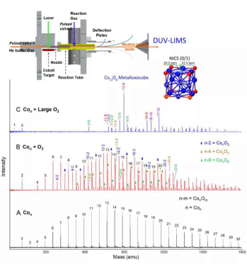研究团队使用先进的皮秒脉宽177.3nm深紫外激光高效光电离质谱(DUV-LIMS)技术,气相合成了一系列Con团簇,并观测了中性钴团簇与氧气的反应,从中发现了具有特殊稳定性的幻数团簇Co13O8 (如下图)。