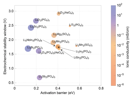 研究团队应用这套材料搜索方法,从数据库的54万余种无机化合物中快速找到了104种潜在的快离子导体材料。进一步通过第一性原理计算方法准确获得了材料的离子电导率、电子电导率和电化学稳定窗口,从104种候选材料中找到了13种适用于锂电池固态电解质的新材料,其中若干材料的离子电导率超过1 mS/cm且电化学稳定窗口超过1.5V。上述结果表明,基于图论的无机材料结构研究方法可以显著提升对快离子导体材料筛选与设计的效率,为实现从原子尺度探索材料构效关系并开发新型固态锂电池材料提供了一个有力的工具。