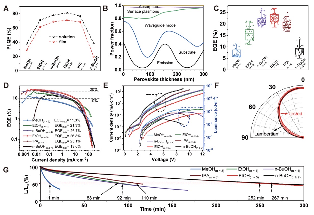 载流子动力学研究表明,电荷转移是钙钛矿LED工作条件下的主要能量传递途径。在该量子点LED中,由于较慢的电荷转移和较低的Förster共振能量转移概率,电致发光比光致发光表现出明显的蓝移,即有更多光子从小n值的量子点发射。这一载流子动力学的研究也解决了在多n值体系中Förster共振能量转移或电荷转移所引起的漏斗效应的能量传递机制争论,为量子点LED的设计提供了重要的理论指导。