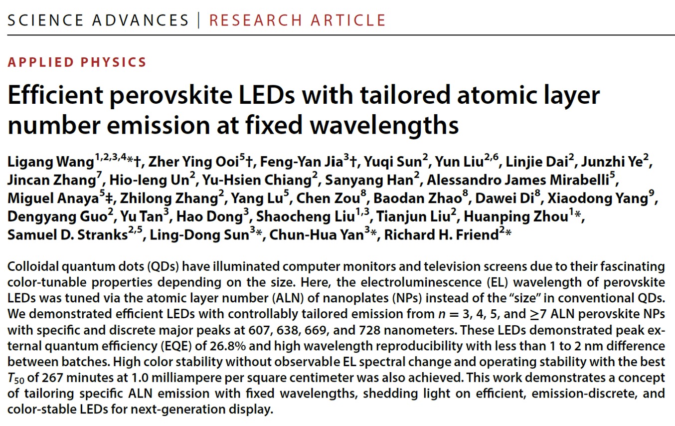 严纯华/孙聆东课题组与剑桥大学卡文迪许实验室Richard Friend课题组合作,成功实现了不同原子层数量子点的高效发光二极管(LED)。该LED的电致发光峰值在607-728 nm范围内可控调节,并实现了26.8%的外量子效率(EQE)。这一成果对于高清显示领域具有重要意义,并已于2025年2月14日发表于国际知名期刊《科学·进展》(Science Advances),题为“Efficient perovskite LEDs with tailored atomic layer number emission at fixed wavelengths” (DOI: 10.1126/sciadv.adp9595)。