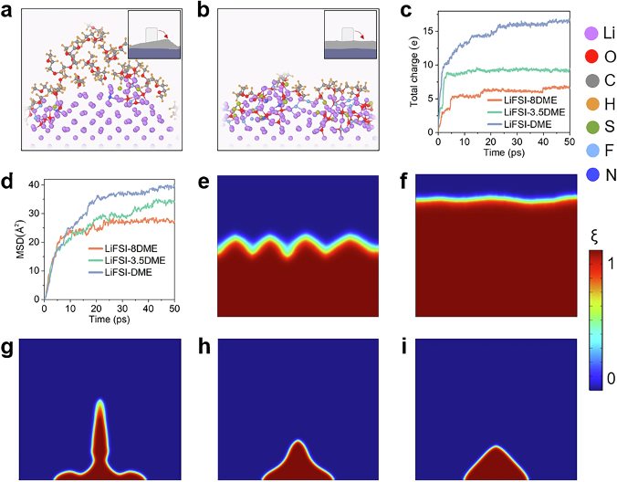 研究团队开发的耦合电荷矩张量势(QMTP)模型实现了原子尺度相互作用的动态追踪,并阐明了决定这些反应的电荷转移主导机制。此外,研究团队通过多尺度模拟成功建立了界面反应与锂枝晶生长的关联机制,揭示了电荷转移对界面反应的触发作用及其受电解液浓度影响的规律。研究发现,初始反应阶段更快的电荷转移动力学是调控枝晶生长的关键主导因素。值得注意的是,高浓度电解液体系会促进LiF等无机产物的生成,并形成更致密的界面堆积层。并且,与低浓度体系相比,高浓度电解液下锂金属负极被氧化的趋势更强,导致总电荷快速增加。