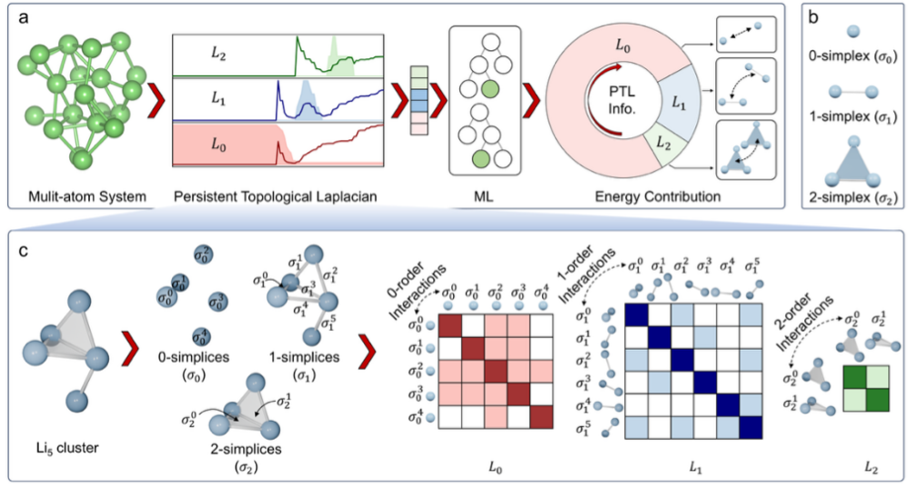近日,潘锋教授团队与密歇根州立大学魏国卫(Guo-Wei Wei)教授团队合作,提出名为“多尺度拓扑学习(Multiscale Topological Learning, MTL)”的可解释性框架,显著提高了多原子体系能量预测精度。该研究采用“持续拓扑拉普拉斯(Persistent Topological Laplacians, PTLs)”方法,通过多尺度拓扑分析有效捕捉多体相互作用的内在属性。相关研究成果以“Enhancing Energy Predictions in Multi-Atom Systems with Multiscale Topological Learning”为题,发表于国际材料与化学知名学术期刊 Journal of Materials Chemistry A (2025,DOI: 10.1039/d5ta02687c)。