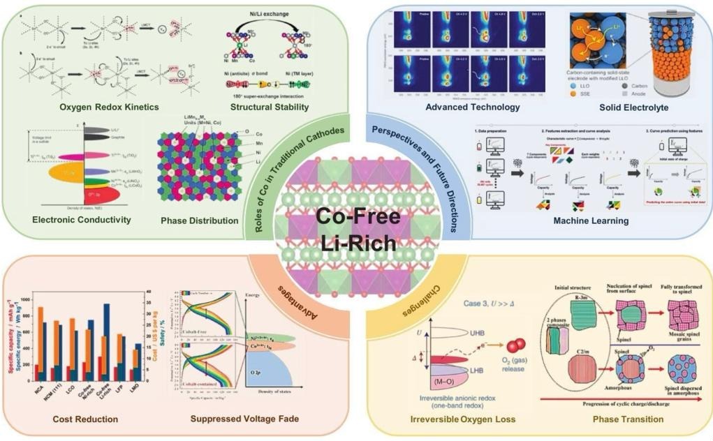 相关学术成果以综述论文“Toward Sustainable Batteries: Comprehensive Insights into Cobalt-Free Lithium-Rich Manganese-Based Cathodes”为题,发表于国际材料科学知名期刊《Materials Today》(IF=22)。该综述论文系统剖析了钴元素在传统正极中的多重作用,深入探讨了无钴化面临的挑战与改性策略,并为下一代高性能、低成本、环境友好型电池的设计提供了重要参考。