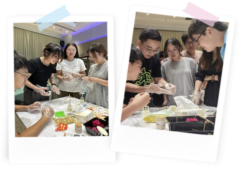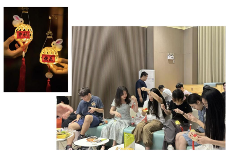 同学们准备好灯笼材料包,制作中秋节兔子灯笼,穿针引线沉浸式体验传统文化魅力。随后分组制作冰皮月饼,通过层层工序,分工合作,将干果的醇香回味与面皮的绵软细嫩结合在一起,其乐融融,传递手中与舌尖上的美好愿景。
