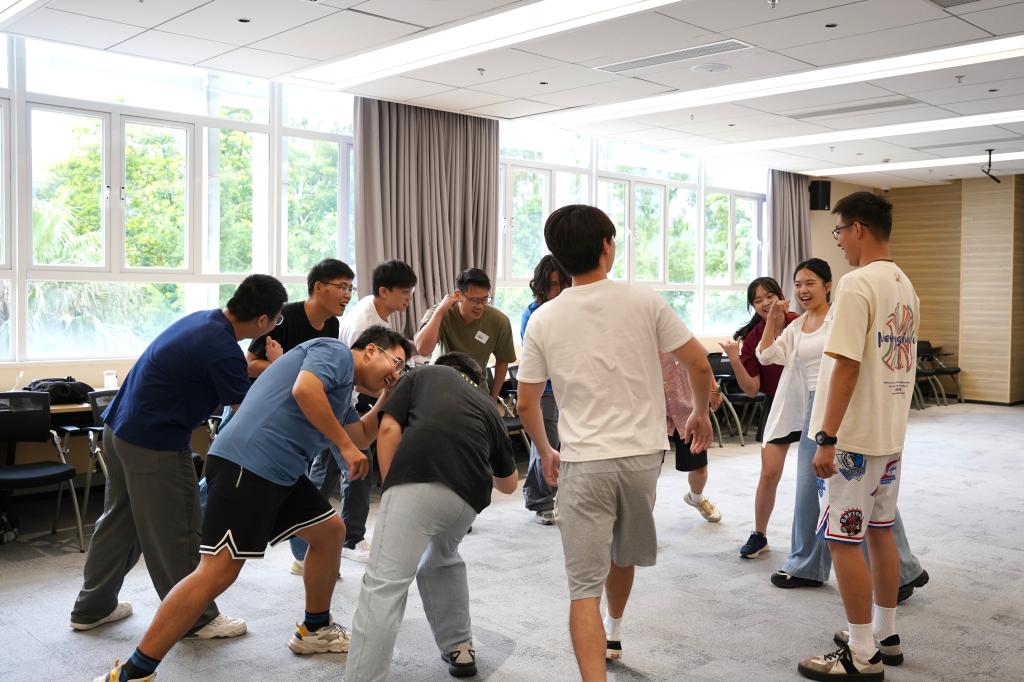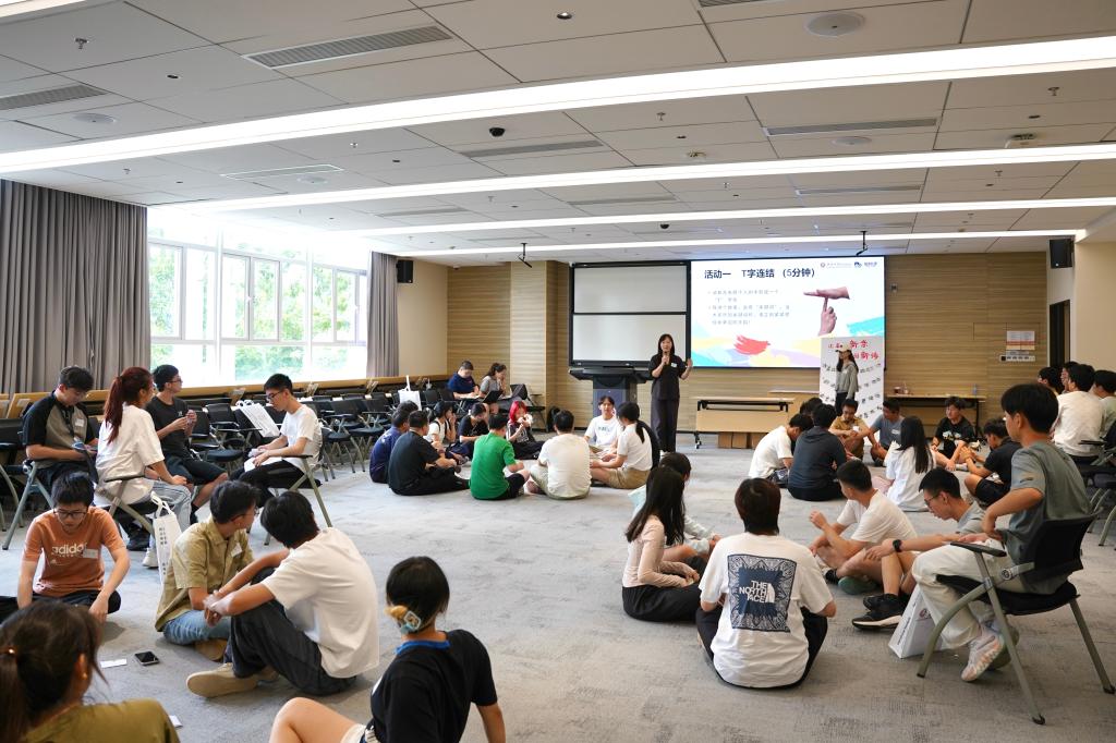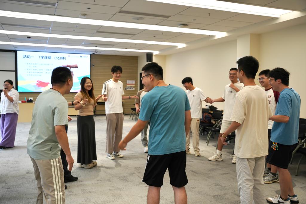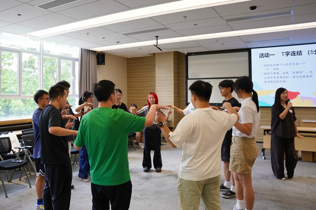 首个环节“T字连结”迅速点燃了现场氛围:同学们与左右两位同学以“T”字形手势相连,听到信号后立刻抓住旁边同学的手指。这是充满反应与欢笑的破冰小游戏,不仅打破了刚开始的沉默与陌生,更让大家在互动中放松下来,眼神交流与微笑渐渐增多。
