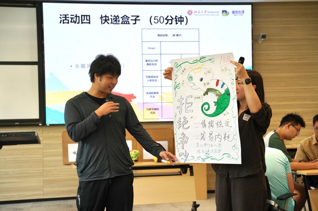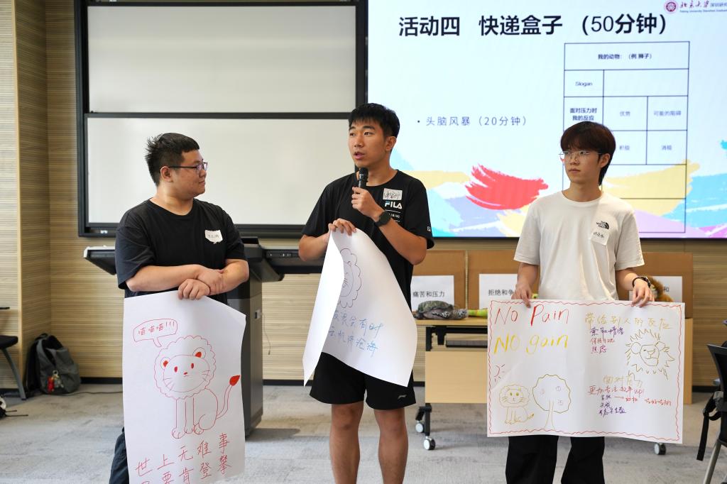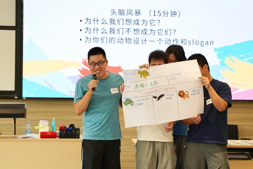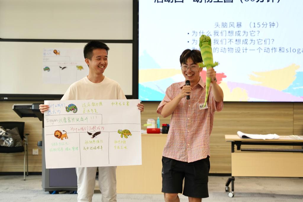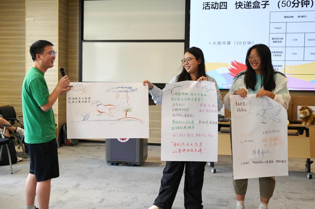 在老师的引导下,同学们通过“动物类型”识别自己的生活态度取向,并找到同类伙伴。各组推选代表、集体 brainstorm,共同拟定口号、绘制海报。同学们积极讨论、畅所欲言,甚至穿插着幽默的调侃,整个过程既热烈又温暖。最后,各组代表上台分享对该类性格特质及其优缺点的理解,还结合未来科研生活中可能遇到的挑战提出了应对方法。代表发言时台下回应热烈,将全场氛围推向高潮。