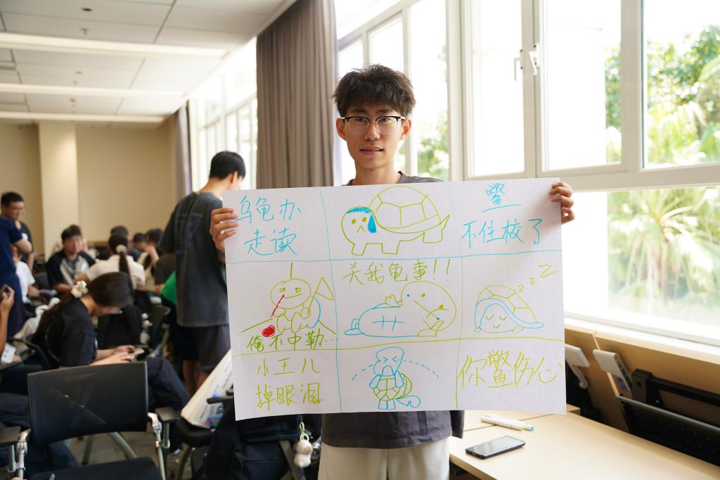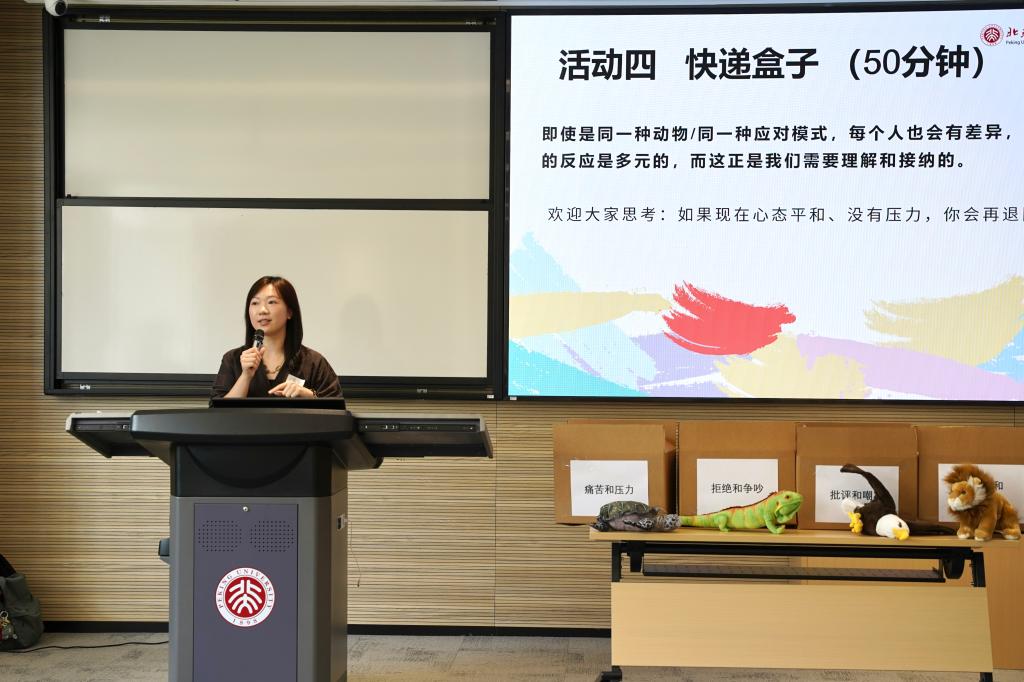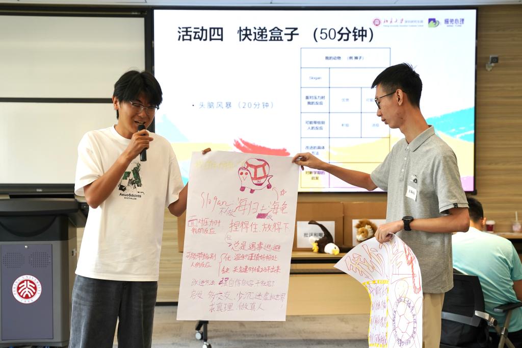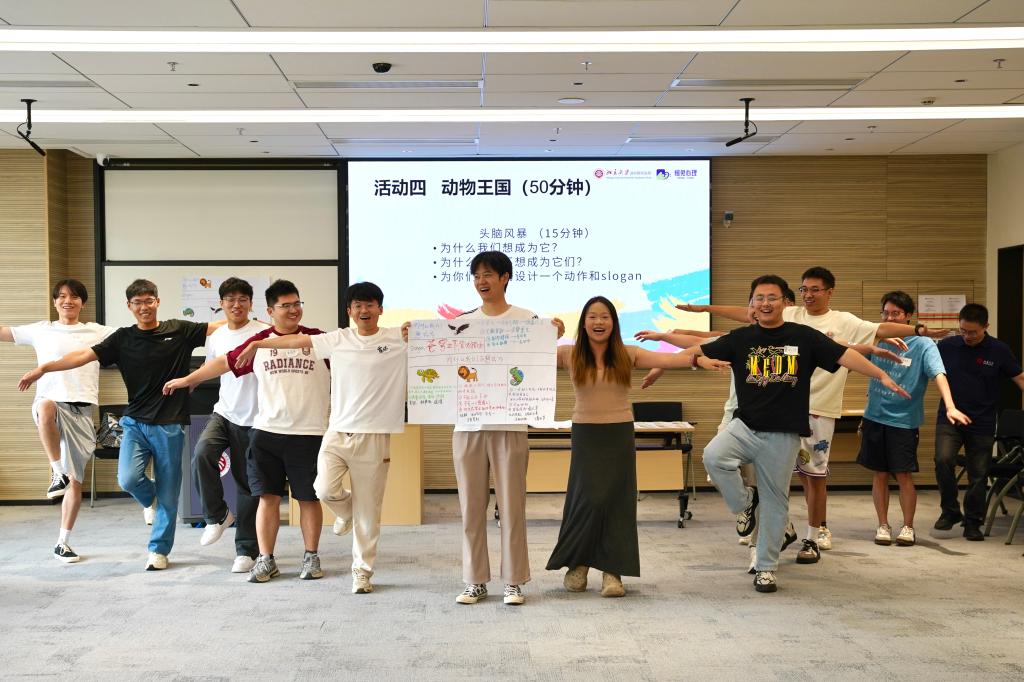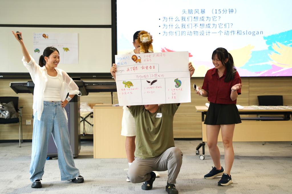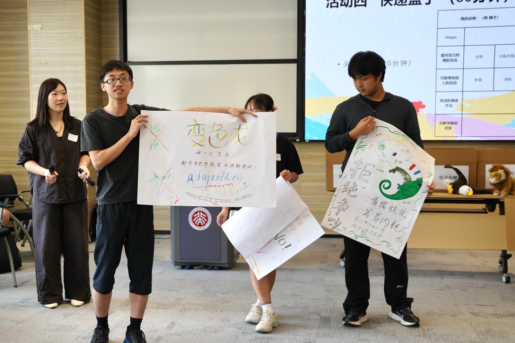 在老师的引导下,同学们通过“动物类型”识别自己的生活态度取向,并找到同类伙伴。各组推选代表、集体 brainstorm,共同拟定口号、绘制海报。同学们积极讨论、畅所欲言,甚至穿插着幽默的调侃,整个过程既热烈又温暖。最后,各组代表上台分享对该类性格特质及其优缺点的理解,还结合未来科研生活中可能遇到的挑战提出了应对方法。代表发言时台下回应热烈,将全场氛围推向高潮。