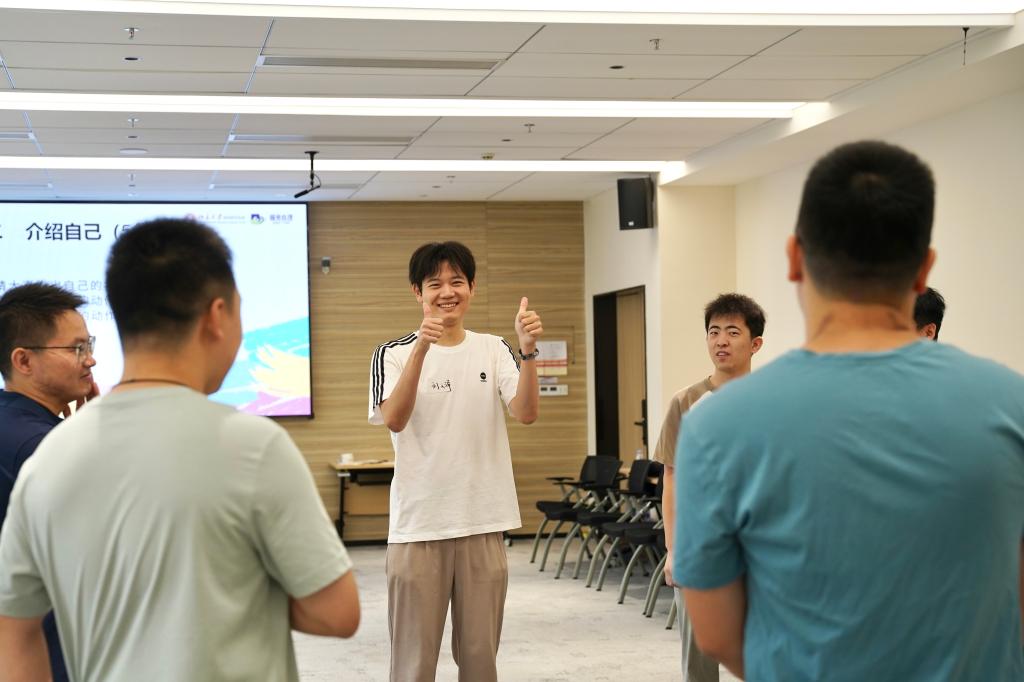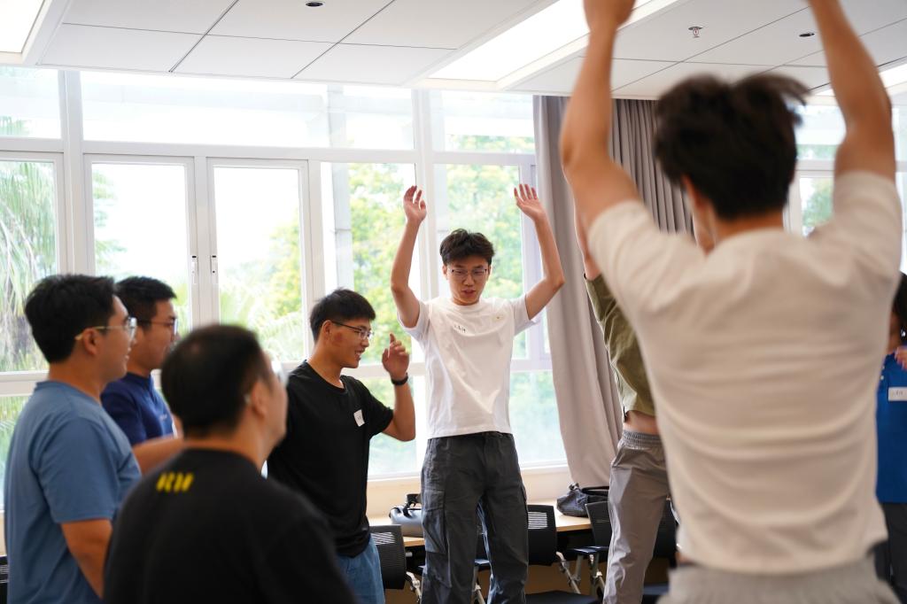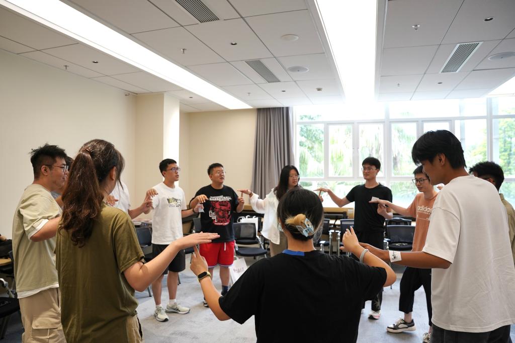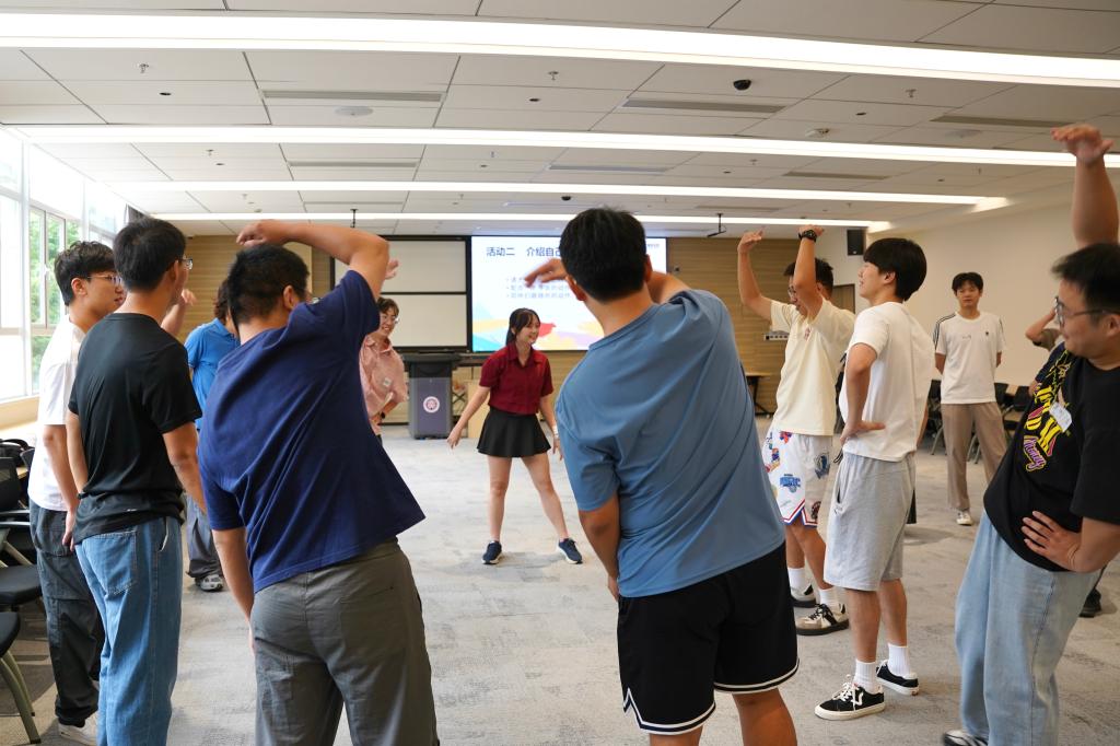 初步破冰后,老师引导同学们进行自我介绍。与常规形式不同,大家围成一圈,在说出自己名字的同时还需配上一个夸张的动作,而其他同学则用热情欢呼他的名字予以回应,同时重复动作。轻松有趣的节奏帮助大家迅速记住彼此,在反复的欢笑与呼应中建立起初步的默契。