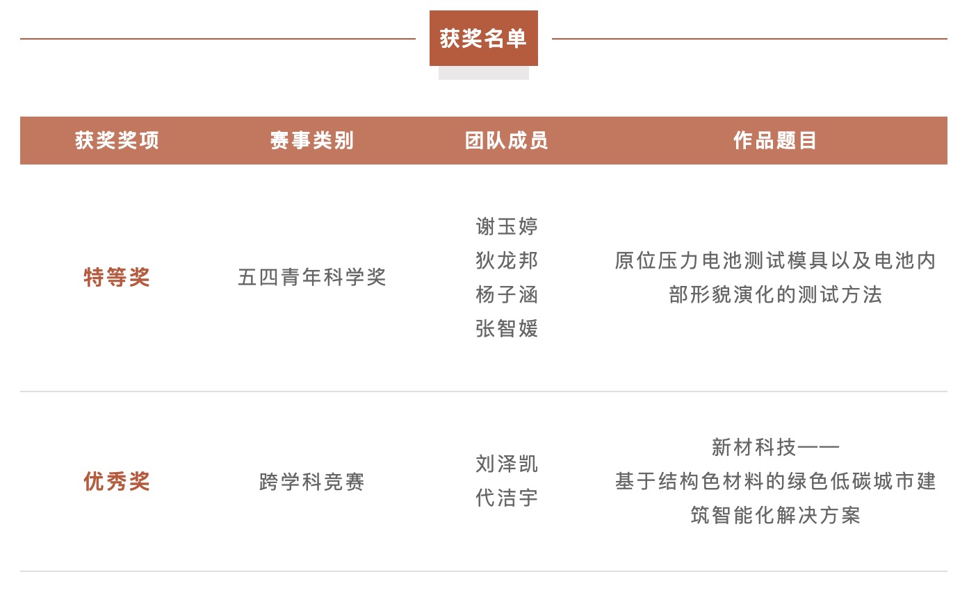 共两支队伍参赛并斩获佳绩,荣获五四青年科学奖特等奖1项、跨学科竞赛优秀奖1项。特此向获奖团队及指导老师表示祝贺!