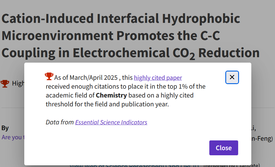 我以第一作者身份在Journal of the American Chemical Society上发表了“离子诱导的界面疏水微环境促进C-C偶联”的研究,针对二氧化碳还原反应的复杂体系,创新性地提出界面水氢键网络动态调控机制,揭示了阳离子效应的本质规律。让我感到高兴的是,这篇论文自发表后就收获了许多的引用,其中有团队通过实验表征进一步验证了我们的理论,也有人参考我们的理论设计了新型的高效催化剂,目前该论文已经入选ESI高被引论文。